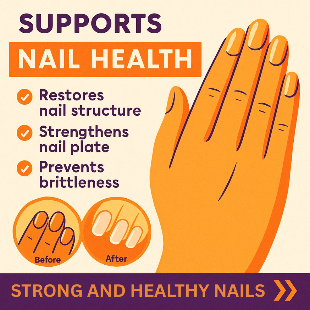 Hydrolysed Type I collagen fortifies the nail’s keratin core for strength, while Type III supports the nail bed for healthy growth. With Type V nourishing the cuticle, nails grow faster, break less, and stay smooth — even after menopause.